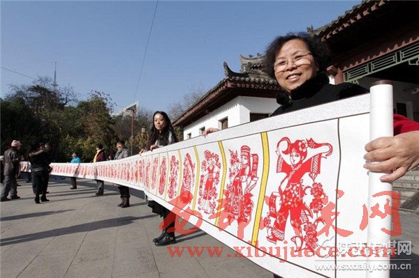 11月30日,在西安市蓮湖公園里,由民間剪紙藝人劉惠霞帶領(lǐng)6名殘疾人學(xué)員、3名志愿者,歷時(shí)一年多時(shí)間,創(chuàng)作的長(zhǎng)22米、寬52厘米的《五十六個(gè)民族》巨幅剪紙作品。