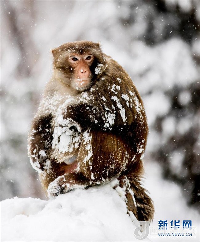 1月4日,安徽省淮北市相山公園的猴子獨立雪中。 當日,淮北迎來一場強降雪。(王文 攝)