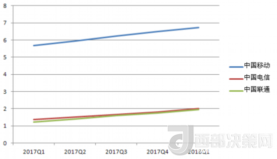 中國電信的營收除了在2017年Q3有所下降,基本處于穩(wěn)步增長趨勢。其2018年Q1的營收數(shù)據(jù)也在三大運營商中排中間。