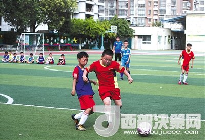 迎新鄉(xiāng)小學(xué)(紅隊)和市里的一支俱樂部球隊正在踢一場友誼賽。