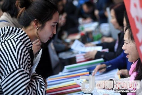 資料圖:招聘會(huì)現(xiàn)場(chǎng)在洽談的雙方。中新社記者 李進(jìn)紅 攝