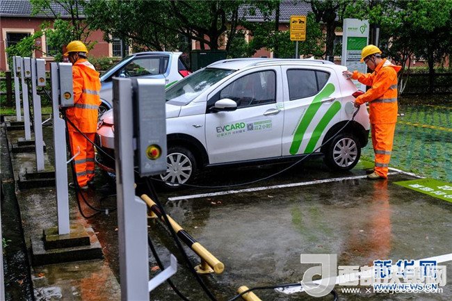 5月31日,工作人員在浙江省麗水市云和縣仙宮湖景區(qū)內(nèi)為電動汽車充電。