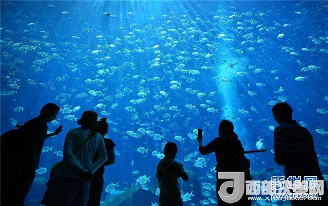 游客在海南三亞亞特蘭蒂斯酒店內的水族館游玩(2月17日攝)。