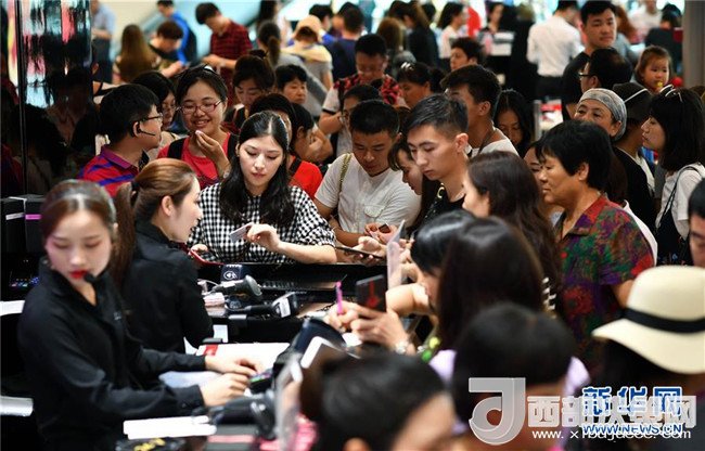 顧客在海南三亞海棠灣免稅店內的一家化妝品店排隊付款(2月18日攝)。