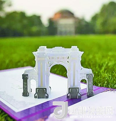 他輕輕打開印有清華大學?;盏淖仙鈿?,一座獨具設計感的清華地標微型二校門躍然紙上。