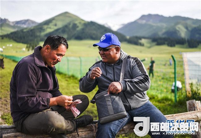 那拉提“空中草原”游牧人家馬隊的兩位牧民正在數(shù)當日的收入(7月8日攝)。