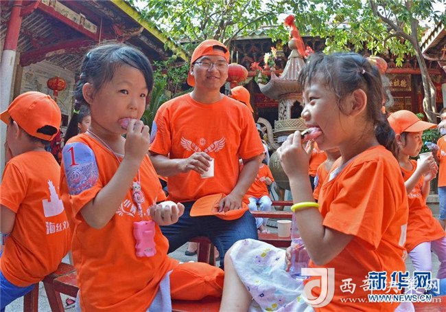 為進一步豐富廣大外來務(wù)工人員子女的暑期生活,福建省泉州市泉港區(qū)先后邀請轄區(qū)130多戶外來務(wù)工人員家庭,一起參觀當?shù)胤逦补懦?,體驗海絲文化。新華社發(fā)(林弘梫 攝)