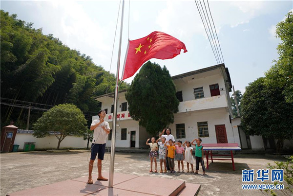 9月4日,在蘆嶺教學(xué)點(diǎn),陳云根(后)和黃文春(前)帶著全校6名學(xué)生升國旗?,F(xiàn)在學(xué)校操場已經(jīng)鋪上了水泥。新華社記者 宋振平 攝