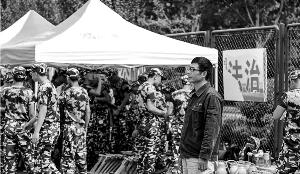 郇政華和穿著軍訓服的新生們在校園里。