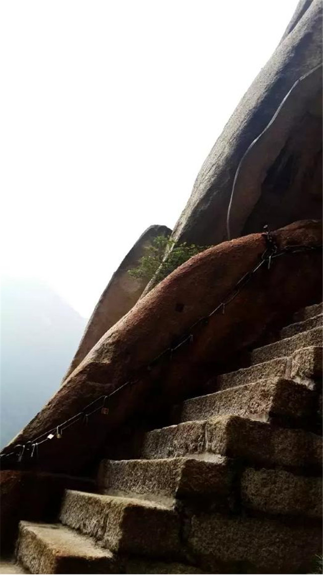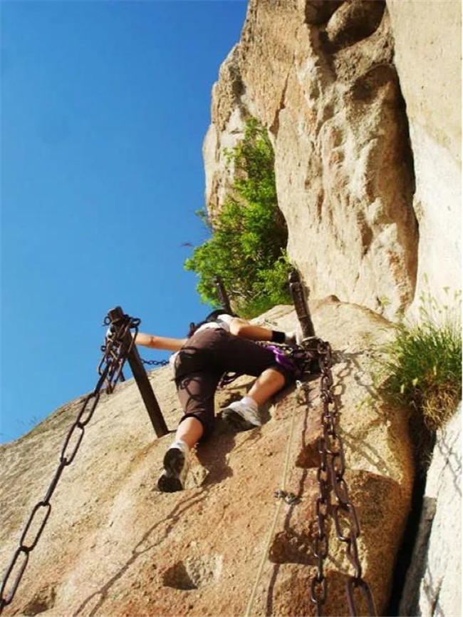 這是一條峭壁上的大裂縫,陷在兩旁的巨石之間,共370余級臺階坡度極陡,每級臺階的寬度不過三分之一的腳掌,幸好兩旁都有可助攀爬的鐵鏈。仰望天際,一線天開。俯視腳下,如臨深淵。石級頂端有如井口,倘若把“井口”用鐵蓋蓋住,通往華山的道路便被堵塞,所以稱之為“太華咽喉”。