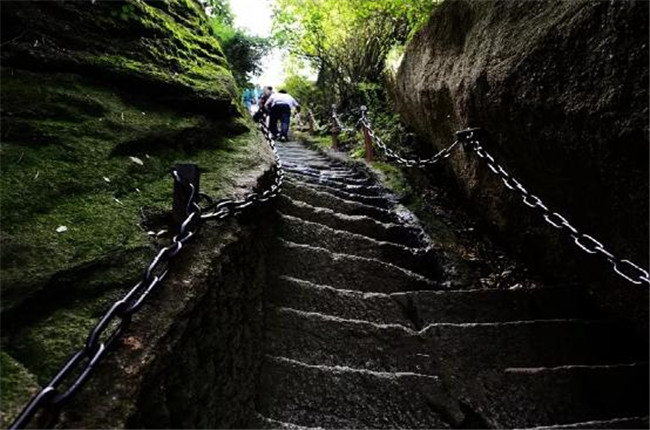云梯高十余米,與地面垂直呈90度角,中上部外突,呈倒坎崖之勢。梯上置懸索三條,游人挽索而攀,身體無法貼近崖壁,因而隨索擺動,心旌神搖,如同云駕霧,故名云梯。云梯的開辟,既縮短了自中峰登東峰的時間,又增加了游人履險的興趣,開通以來,許多游客都愿在此攀登,一試身手。