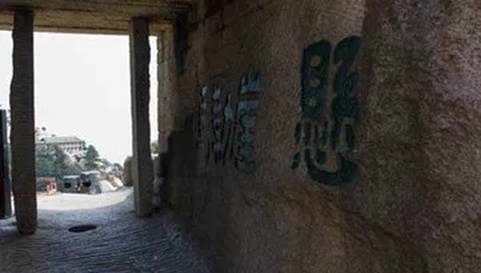 長空棧道筑在光溜溜的千仞絕壁上,真正接近90度,上望崖壁好幾十米,下望至少二、三百米不見谷底,棧道寬僅三十多公分,一邊空懸并無欄桿,一邊崖上釘有鐵索可供抓手。上下皆是懸崖絕壁,鐵索橫懸,由條石搭成尺許路面,下由石柱固定。這里只是探險(xiǎn)之道,并非登山必由之路,膽小的人在升表臺(tái)看看就行了,膽大的則可攀爬而上。所以石刻上不少警告之語:"懸崖勒馬"等。