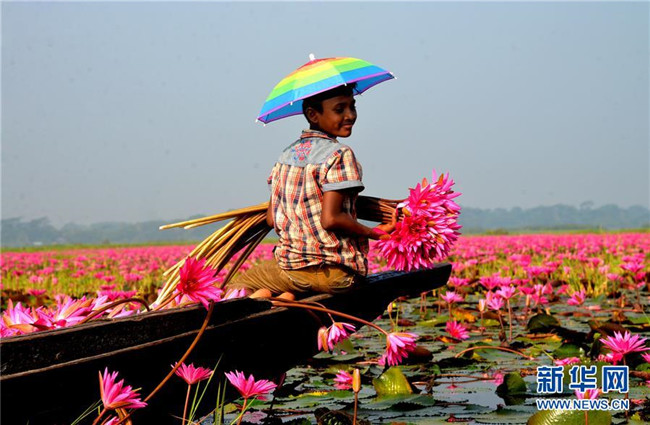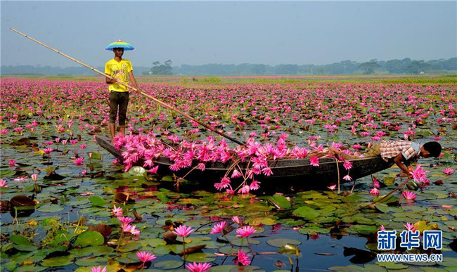 10月7日,在孟加拉國巴里薩爾地區(qū),當(dāng)?shù)鼐用裨诓烧彙?近日,孟加拉國巴里薩爾地區(qū)的睡蓮進(jìn)入盛開時(shí)節(jié)。 新華社發(fā)(薩利姆·禮薩 攝)