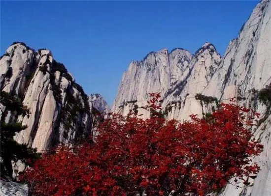 華山的紅葉浪漫而熾烈,她使蕭瑟的群山充滿了生機(jī)和活力。那些五角楓樹和黃櫨葉子在薄暮中分外地紅著,在陽光中到處閃動著鮮紅的翅膀,想要與彩霞或夕陽一起飛翔。人們猜想,那一定是調(diào)皮的小廝盜了弄玉的胭脂潑在了山坡上,要不然,華山的紅葉紅葉何以會漫山遍野,何以會如此熾紅而且多情。