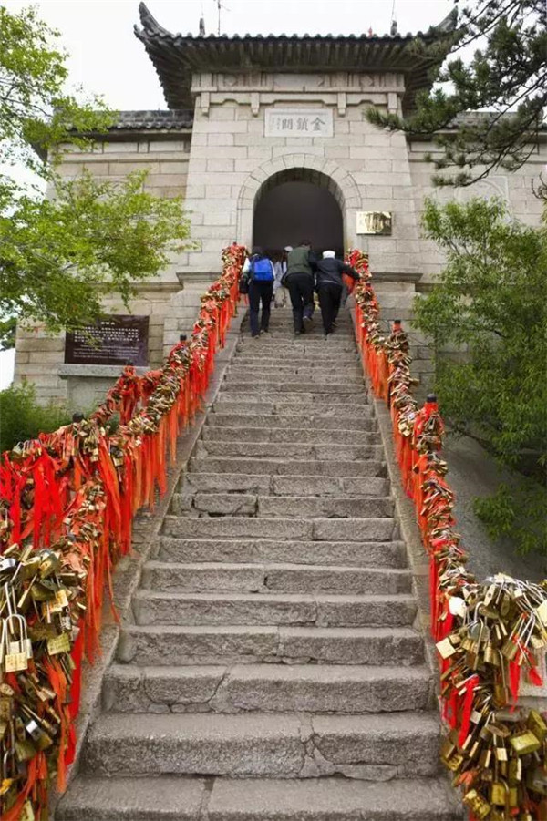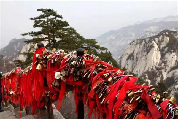 金鎖關(guān)北接五云峰,南控華山主峰,東西兩側(cè)壑深千丈,關(guān)前僅有一米完的臺階石徑。環(huán)周古松蒼翠,奇石林立,常有祥云環(huán)繞,風光非常迤麗。“但有女兒初長成,便為三秦姣姣容。”說的就是奇險天下第一山的華山除了以其奇、險、秀而聞名遐邇之外,還別有一番令人動容的金鎖關(guān)風景:關(guān)內(nèi)、關(guān)外登山路兩側(cè)的鐵索上,情侶鎖、平安鎖,重重疊疊,紅繩彩線迎風搖曳,筑成一道美麗的愛情風景線,鎖住對愛情的誓言,表達堅如磐石的愛情忠貞!
