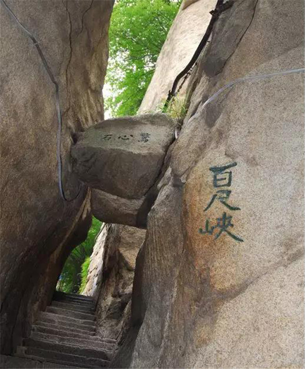 也叫“百丈崖”,過了千尺幢向北折即可到達(dá),是登華山的第二個險境。這里山體峭陡壁立、四方如削,猶如斧子直辟而開,幾近垂直90度,在旁邊山體覆滿的墨綠植被的映襯下,華山的陽剛挺拔之態(tài)盡顯。和千尺幢一樣,百尺峽也是巖隙險道,有石階91級,游人須挽鐵索而上。
