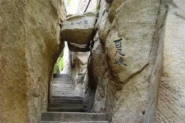 幢去峽復(fù)來(lái),天險(xiǎn)不可瞬。雖云百尺峽,一尺一千仞。”過(guò)千尺幢向北折即到“百尺峽”,它也叫“百丈崖”,仍是一處危石聳峙,直插云表,令人望而生畏的地方。峽的兩壁欲合,卻被飛來(lái)的兩顆石塊從中撐開(kāi),人從石頭下鉆過(guò),膽戰(zhàn)心驚,生怕石塊從兩壁間掉下來(lái),這就是“驚心石”。通過(guò)此石懸著的心才放下來(lái),再回頭看原來(lái)此處卡著的兩塊石頭,是上大下小故能安然無(wú)恙,所以這顆石頭也被稱之為“平心石”。故韓愈詩(shī)中有“俄然神功就,殺氣見(jiàn)棱角”的描寫。