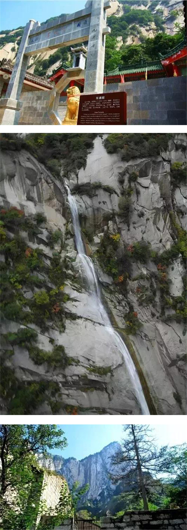 青柯坪背依主峰,絕壁千仞,拔地而起;水簾瀑布,如從云天垂落,跌落谷中,聲如雷霆,主峰由于總是處在逆光和側(cè)逆光中,就象巨靈神剪影緊貼天幕之上。登臨青柯坪,還可眺望秦川,那種感覺就如從洞天俯視塵寰。四周峰巒環(huán)繞,林木蔥郁,山寺石洞,掩映其間,這里就是華山風(fēng)水的結(jié)穴處。我們現(xiàn)在所處的是西道院又名紫云宮,這里供奉的是“三霄”娘娘,為道教送子神。明朝時為太華書院,名儒馮從吾坐館任教,著書立說,從學(xué)者三百,可想當時的盛況。