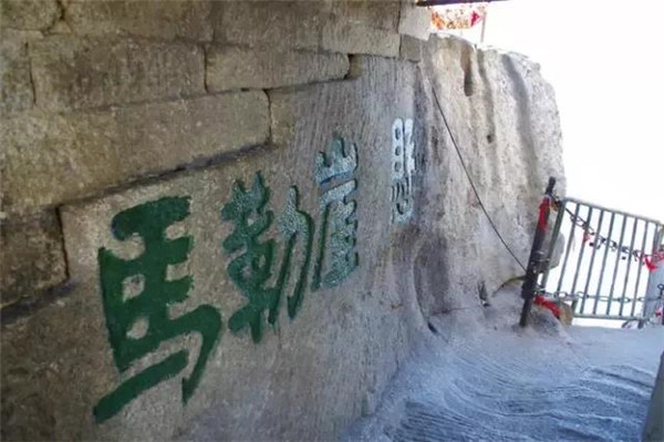 華山長空棧道上下皆是懸崖絕壁,鐵索橫懸,由條石搭成尺許路面,下由石柱固定。由于棧道險峻,故當?shù)厝擞?ldquo;小心九厘三分,要尋尸首,洛南商州”之說。這里只是探險之道,并非登山必由之路,膽小人就在升表臺看看也就行了。所以在長空棧道的入口處,就有這樣一塊石刻,上邊刻著“懸崖勒馬”四個大字。懸崖勒馬的字面意思就是說在高高的山崖邊上勒住馬。比喻到了危險的邊緣及時清醒回頭。面對長空棧道這樣險峻的地勢,游人確實要比正常情況下更加清醒。