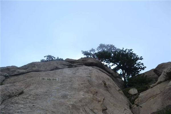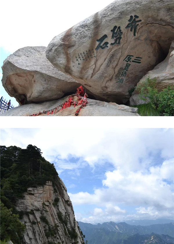 在南峰頂,孩子看到“天下絕無沉魚面,太華獨(dú)有落雁峰”的題刻,打趣我:“媽媽,你叫鴻雁,這里又叫落雁峰,真是和你有緣呢!快來這塊大石頭上落落腳,歇一歇!”“好??!咱倆都爬累了,都歇一歇!”我為孩子的體貼欣慰!