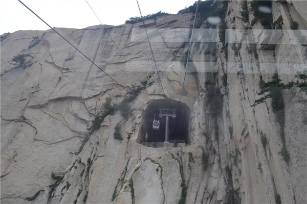現(xiàn)在爬華山可不是“自古華山一條道”了,我們選擇坐西峰索道纜車,凌空飛渡千山萬壑。說是千山萬壑,其實(shí)華山是由一塊完整碩大的花崗巖石體構(gòu)成的。《山海經(jīng)》記載:“太華之山,削成而四方,其高五千仞,其廣十里。”真的很難想像,這么連綿起伏、巨大的山體,其實(shí)是一個(gè)群峰競秀的整體。華山,就是這么神奇!