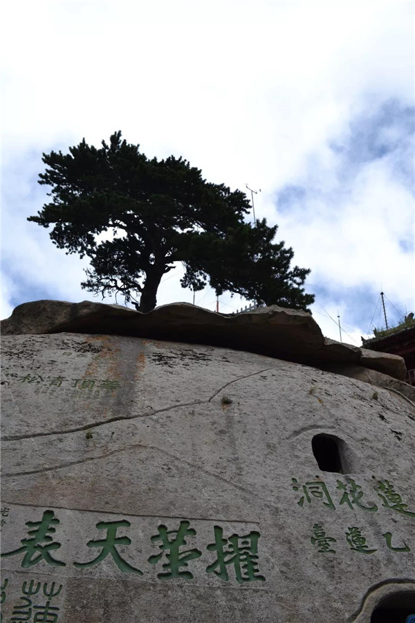 小心謹(jǐn)慎通過青龍背,迎面一方碩大石體,石壁滿布?xì)v代石刻,頂端平坦,狀如蓮花,也許這就是西峰又名蓮花峰的由來吧!行不遠(yuǎn),有巨石懸于頭側(cè),原來這就是大名鼎鼎的斧劈石!孩子聽著我講沉血“劈山救母”的美麗傳說,對沉香手中的神斧產(chǎn)生了濃厚的興趣。那巨大的石頭,被神斧劈開,斷面整齊利落,就那么懸在山頂,好像一陣風(fēng)就能吹落。我拉著孩子快步通過斧劈石,總感覺巨石會(huì)從天而降!