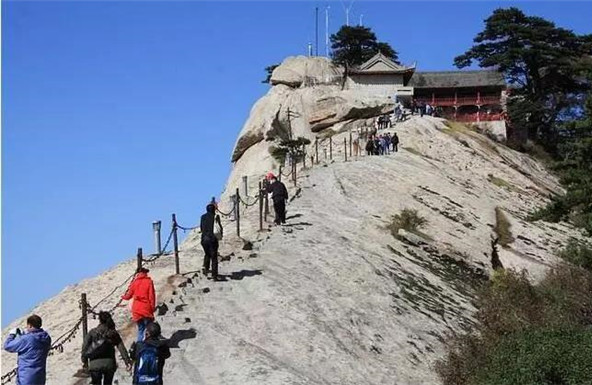 而被大家熟悉的長空棧道,則位于華山南峰東側(cè)山腰,是華山派第一代宗師元代高道賀志真為遠(yuǎn)離塵世靜修成仙,在萬仞絕壁上鑲嵌石釘搭木椽而筑。去過華山的朋友,大部分肯定體驗(yàn)過華山長空棧道,在千仞絕壁之上,左邊是大山,而右邊就是萬丈深淵,想要通過僅僅是靠著腳下這一寬30多公分的棧道,周圍無任何欄桿,但令人興慶的是,在崖上還有釘?shù)睦喂痰蔫F索可以抓住,讓探險者可以稍微放松一點(diǎn)心情。