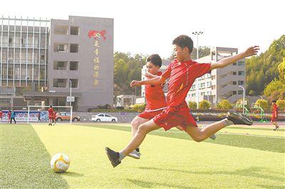 日前,湖北省武漢市英山縣思源實驗學(xué)校綠茵操場上,學(xué)生正在進行攔截?fù)屒蛴?xùn)練。為了培養(yǎng)學(xué)生的足球興趣,該校開展了“陽光足球大課間”體育活動,倡導(dǎo)全體師生充分享受課間足球運動。(單藝偉/攝)