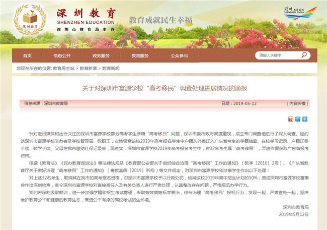 深圳市教育局網(wǎng)站12日發(fā)布《關于對深圳市富源學校“高考移民”調查處理進展情況的通報》(以下簡稱《通報》)。《通報》指出:經(jīng)查實,深圳市富源學校2019年高考報名考生中,有32名考生屬“高考移民”,弄虛作假獲取廣東省報考資格。將取消此32名考生在深圳市的高考報名資格。