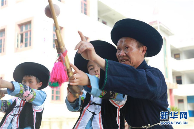 5月14日,在畢節(jié)市黔西縣協(xié)和鎮(zhèn)立新村立新小學(xué),孩子們在老師的指導(dǎo)下學(xué)習(xí)蘆笙。新華社發(fā)(周訓(xùn)超 攝)