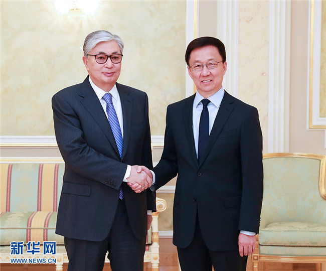 在會見托卡耶夫時(shí),韓正首先轉(zhuǎn)達(dá)了習(xí)近平主席對托卡耶夫總統(tǒng)的親切問候。韓正說,在兩國元首的戰(zhàn)略引領(lǐng)和親自推動下,中哈全面戰(zhàn)略伙伴關(guān)系快速發(fā)展,雙方政治互信日益加深,各領(lǐng)域合作處于歷史最好水平,在地區(qū)乃至全世界樹立了睦鄰友好、互利共贏的典范。上個(gè)月習(xí)近平主席同納扎爾巴耶夫首任總統(tǒng)舉行了富有成果的會晤,向他頒授中華人民共和國“友誼勛章”,向國際社會展現(xiàn)了中哈關(guān)系的高水平和特殊性。共建“一帶一路”已成為中哈合作主線,雙方在發(fā)展戰(zhàn)略對接、合作機(jī)制建設(shè)、重大項(xiàng)目推進(jìn)等方面碩果累累。中方愿與哈方一道,繼續(xù)深化絲綢之路經(jīng)濟(jì)帶與“光明之路”新經(jīng)濟(jì)政策對接,以產(chǎn)能、貿(mào)易、互聯(lián)互通、農(nóng)業(yè)、高技術(shù)、金融合作為優(yōu)先方向,不斷提升中哈合作含金量,更好地造福兩國和兩國人民。中方祝愿哈方順利實(shí)施“2050戰(zhàn)略”,在國家發(fā)展事業(yè)中不斷取得新的輝煌成就。