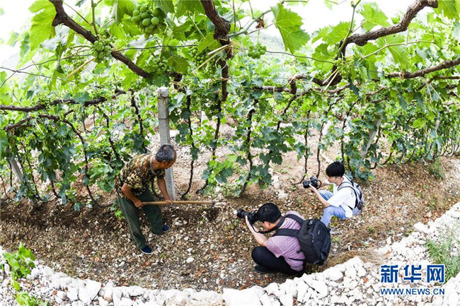 7月2日,河北傳媒學(xué)院的學(xué)生在河北遵化市新店子鎮(zhèn)沙石峪村葡萄園里采訪拍照。 新華社發(fā)(劉滿倉(cāng) 攝)