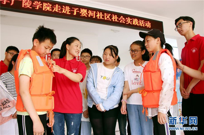 7月2日,揚(yáng)州大學(xué)廣陵學(xué)院大學(xué)生志愿者為寶應(yīng)縣子?jì)牒由鐓^(qū)留守兒童講解救生衣的使用方法。新華社發(fā)(沈冬兵 攝)