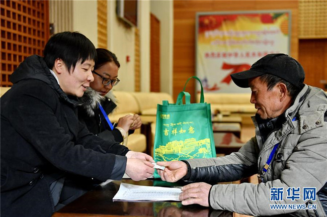 12月23日,在拉薩火車站,一名受助務(wù)工人員(右)從中國郵政集團公司西藏自治區(qū)分公司工作人員手中接過火車票。新華社記者 張汝鋒 攝