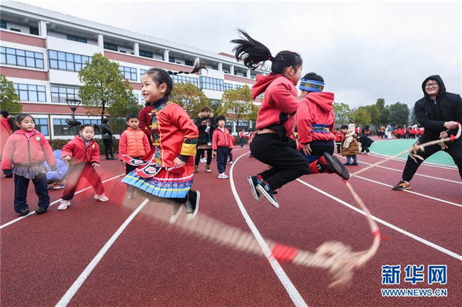 12月26日,孩子們?cè)趨⒓犹ɡK活動(dòng)。當(dāng)日,浙江省長(zhǎng)興縣李家巷鎮(zhèn)中心幼兒園舉辦“炫彩民族風(fēng)歡樂(lè)來(lái)運(yùn)動(dòng)”為主題的趣味民族游戲活動(dòng)。該幼兒園有一些孩子來(lái)自壯族、苗族、布依族等少數(shù)民族。幼兒園旨在通過(guò)這種活動(dòng),讓孩子們和家長(zhǎng)共同體驗(yàn)竹竿舞、篝火舞、擲糠包等少數(shù)民族特色游戲,了解少數(shù)民族特色文化。新華社記者徐昱攝
