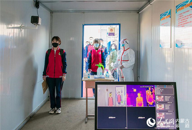 內蒙古呼和浩特市第十二中學返校學生在測量體溫。