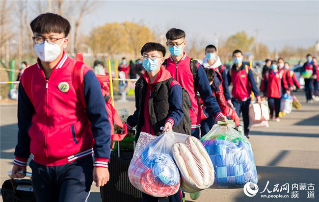 內蒙古呼和浩特市第十二中學住校學生在搬運行李。