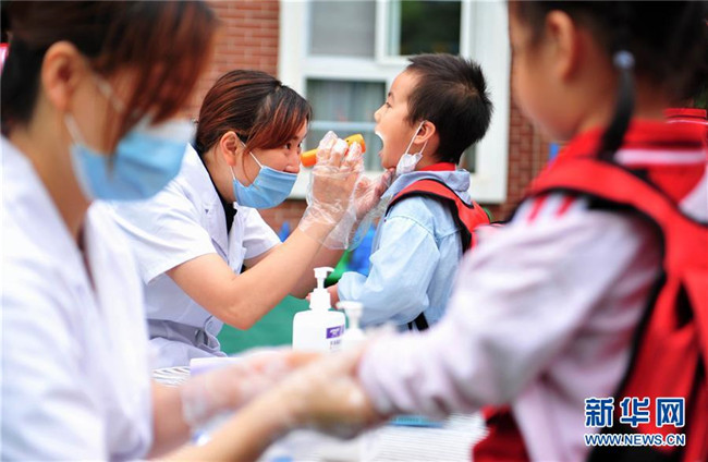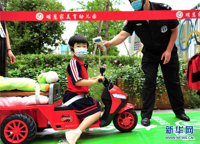 6月2日,成都市龍泉驛區(qū)明慧家美育幼兒園恢復開園,小朋友們在接受入園體檢。 新華社發(fā)(胥冰潔攝)
