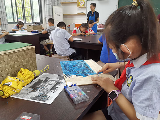 在該校,版畫(huà)社團(tuán)就將美育與勞動(dòng)教育進(jìn)行了融合。美術(shù)老師王帆介紹,版畫(huà)的創(chuàng)作需經(jīng)過(guò)起稿、印板、刻制、拓印等多個(gè)步驟,整個(gè)創(chuàng)作過(guò)程可以鍛煉學(xué)生的細(xì)心、耐心和邏輯思維。