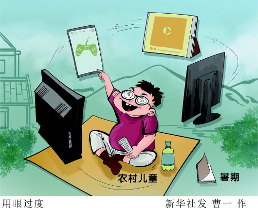 記者走訪發(fā)現(xiàn),暑期用眼過度的現(xiàn)象在不少農(nóng)村兒童中存在。有孩子跟著電視臺追劇,一看就是一整天;有家長晨起上廁所,竟發(fā)現(xiàn)孩子“刷了一夜手機(jī)”;一位媽媽“吐槽”說,為了讓孩子少看電子產(chǎn)品,每天都要“斗智斗勇”:改密碼、藏充電線、沒收手機(jī)……