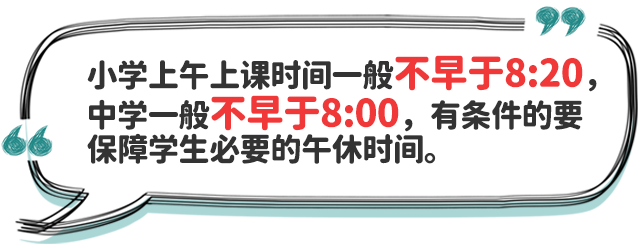 三、統(tǒng)籌安排學(xué)校作息時間。省級教育行政部門要從保證學(xué)生充足睡眠需要出發(fā),結(jié)合實(shí)際情況合理確定中小學(xué)作息時間。小學(xué)上午上課時間一般不早于8:20,中學(xué)一般不早于8:00;學(xué)校不得要求學(xué)生提前到校參加統(tǒng)一的教育教學(xué)活動,對于個別因家庭特殊情況提前到校學(xué)生,學(xué)校應(yīng)提前開門、妥善安置;合理安排課間休息和下午上課時間,有條件的地方和學(xué)校應(yīng)保障學(xué)生必要的午休時間;寄宿制學(xué)校要合理安排作息時間,確保學(xué)生達(dá)到規(guī)定睡眠時間要求。