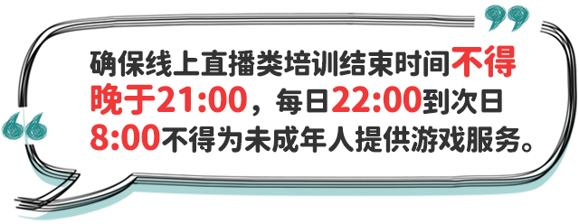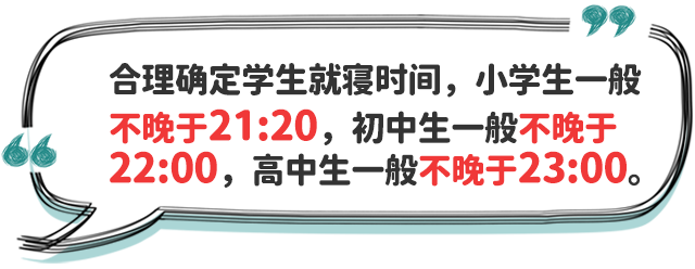 五、合理安排學(xué)生就寢時間。中小學(xué)校要指導(dǎo)家長和學(xué)生,制訂學(xué)生作息時間表,在保證學(xué)生睡眠時間要求前提下,結(jié)合學(xué)生個體睡眠狀況、午休時間等實(shí)際,合理確定學(xué)生晚上就寢時間,促進(jìn)學(xué)生自主管理、規(guī)律作息、按時就寢。小學(xué)生就寢時間一般不晚于21:20;初中生一般不晚于22:00;高中生一般不晚于23:00。個別學(xué)生經(jīng)努力到就寢時間仍未完成作業(yè)的,家長應(yīng)督促按時就寢不熬夜,確保充足睡眠;教師應(yīng)有針對性幫助學(xué)生分析原因,加強(qiáng)學(xué)業(yè)輔導(dǎo),提出改進(jìn)策略,如有必要可調(diào)整作業(yè)內(nèi)容和作業(yè)量。各地教育部門要會同相關(guān)部門切實(shí)加強(qiáng)對轄區(qū)內(nèi)注冊登記或備案的線上培訓(xùn)網(wǎng)課平臺、網(wǎng)絡(luò)游戲的規(guī)范管理,采取技術(shù)手段進(jìn)行監(jiān)管,確保線上直播類培訓(xùn)活動結(jié)束時間不得晚于21:00,每日22:00到次日8:00不得為未成年人提供游戲服務(wù)。
