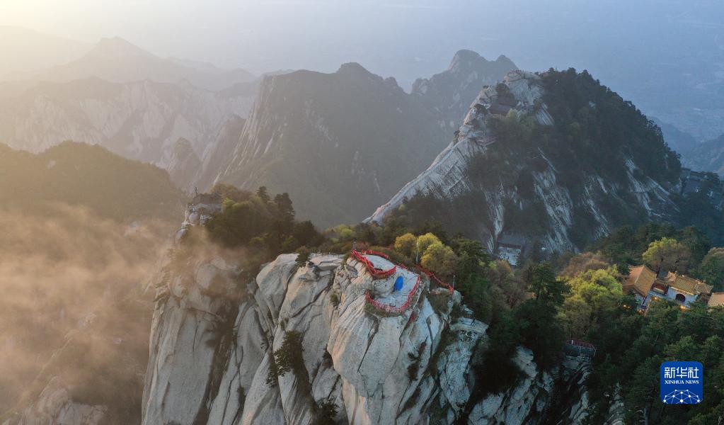 夕陽下的華山南峰(4月28日攝,無人機照片)。新華社記者陶明攝