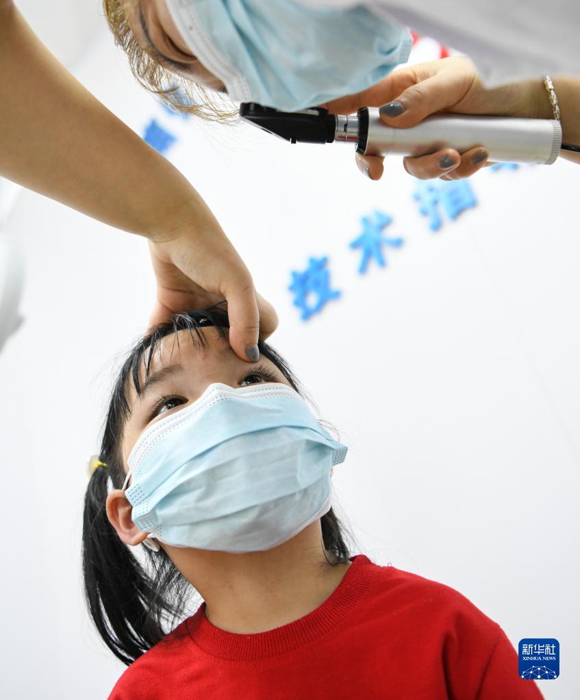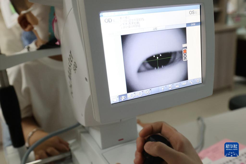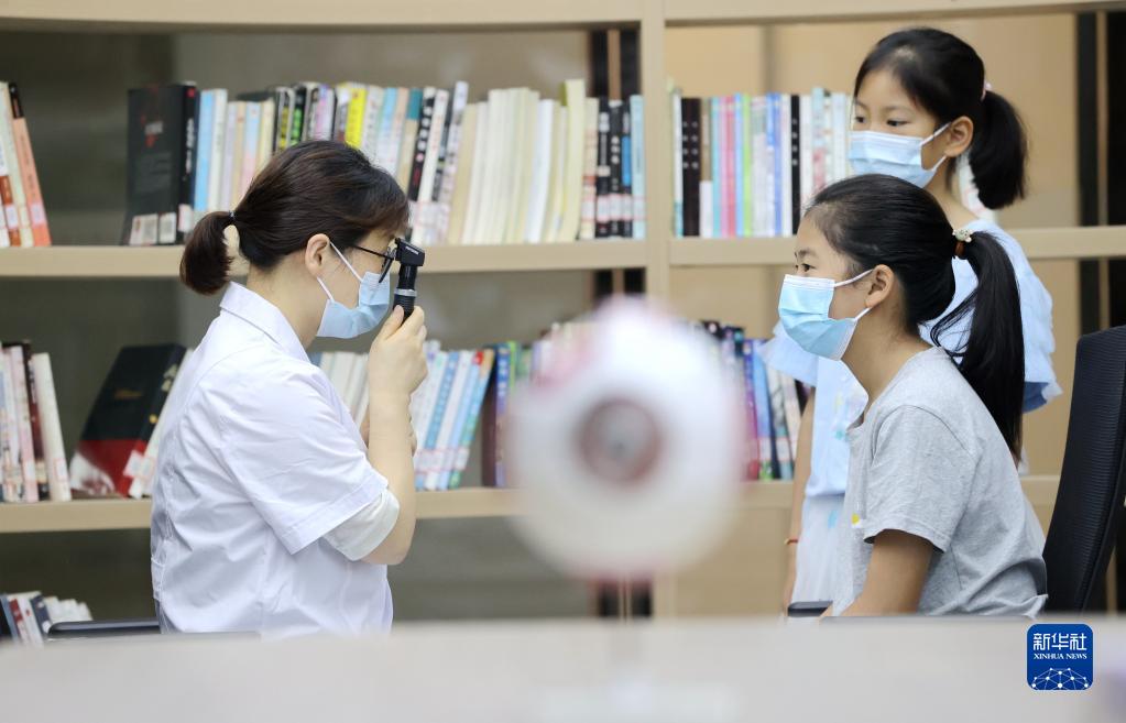 6月5日,在浙江省湖州市德清縣武康街道新豐未來社區(qū),醫(yī)務(wù)人員為社區(qū)兒童檢查視力。新華社發(fā)(謝尚國 攝)
