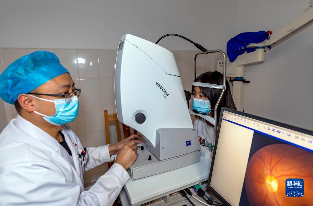 6月5日,湖南省常寧市第三人民醫(yī)院的醫(yī)護人員在為小朋友進(jìn)行眼部檢查。新華社發(fā)(周秀魚春 攝)