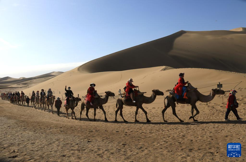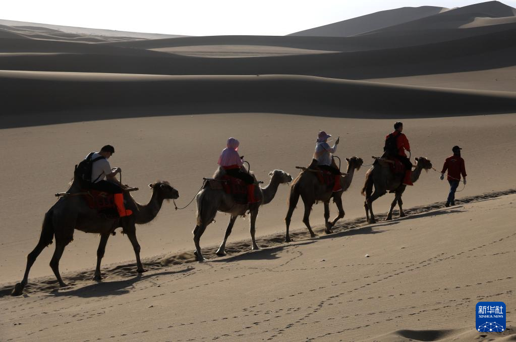 6月19日,游客在甘肅省敦煌市鳴沙山月牙泉景區(qū)騎駱駝游覽。新華社發(fā)(張曉亮 攝)