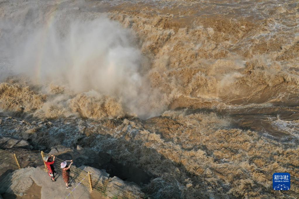 7月4日,游客在黃河壺口瀑布景區(qū)觀瀑(無(wú)人機(jī)照片)。新華社發(fā)(呂桂明攝)