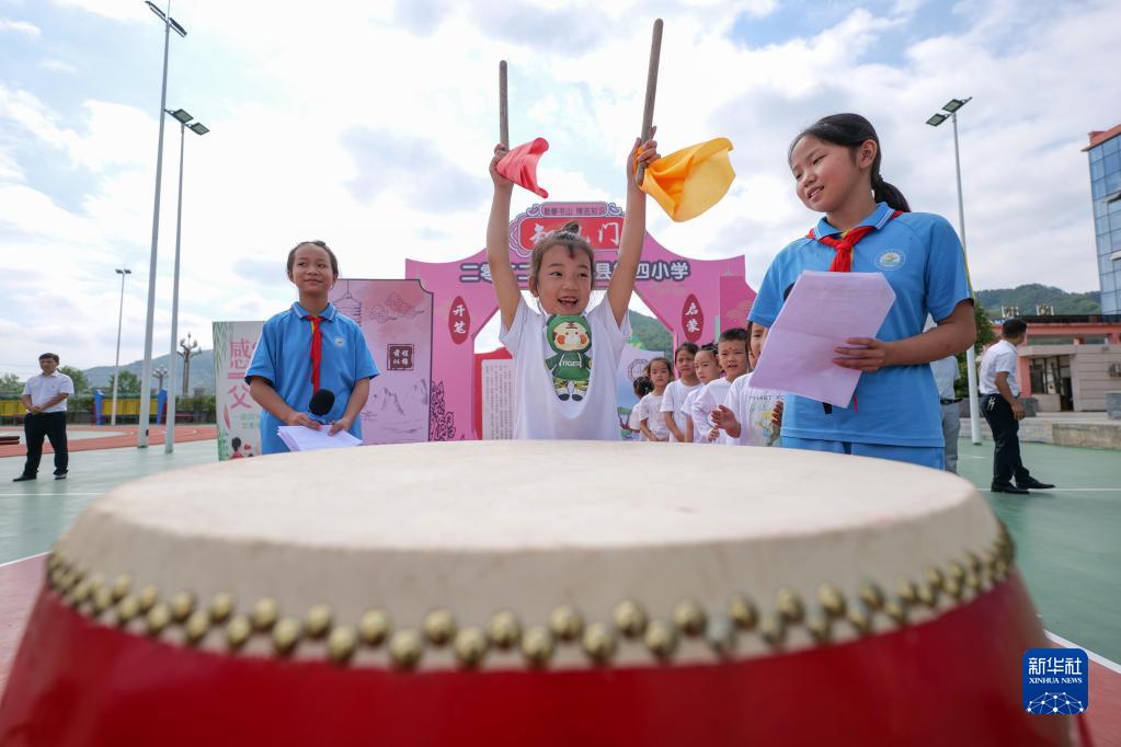 9月1日,貴州省黔東南苗族侗族自治州岑鞏縣第四小學(xué)的學(xué)生在“開筆禮”儀式上擊鼓許愿。新華社發(fā)(楊云 攝)