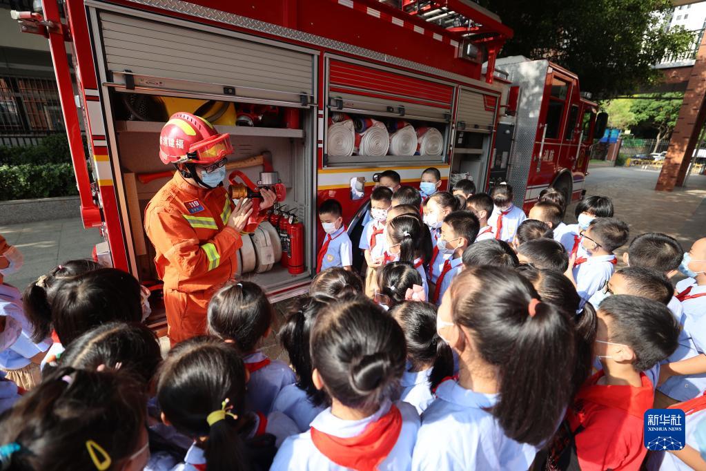 9月1日,在福建省廈門市金安小學(xué),消防員向小學(xué)生們講解消防器材裝備的使用方法。新華社發(fā)(曾德猛 攝)