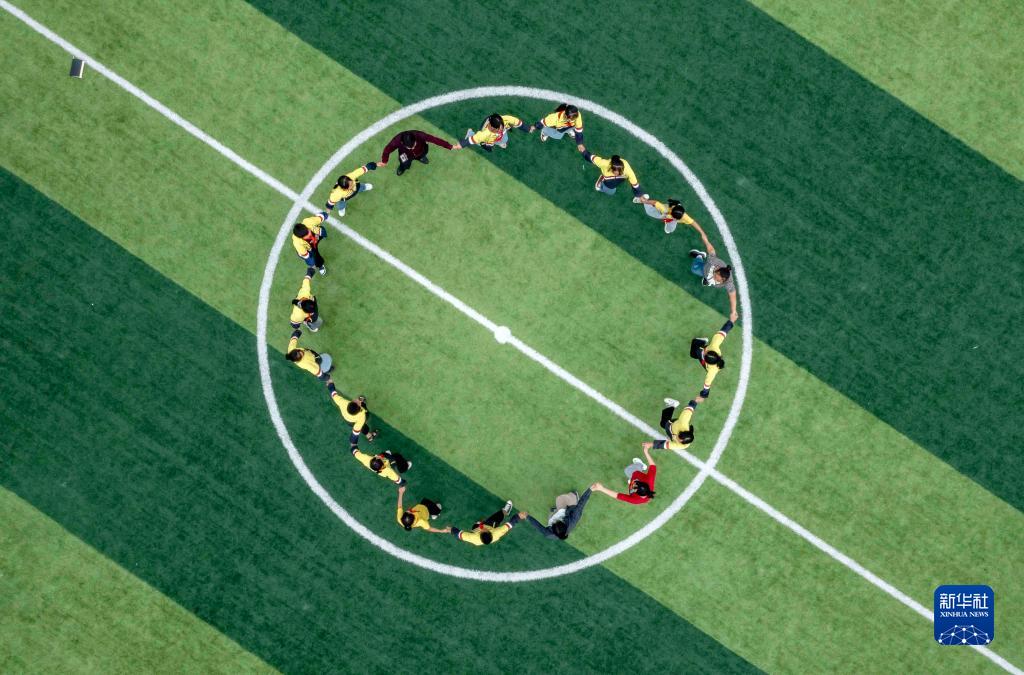 9月1日,貴州省黔西市定新小學(xué)學(xué)生在操場(chǎng)上做游戲(無(wú)人機(jī)照片)。新華社發(fā)(范暉 攝)
